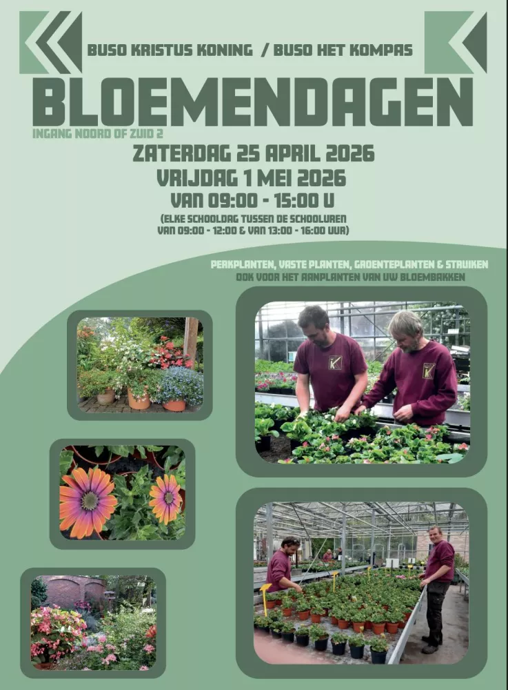 Bloemendagen zaterdag 25 april en vrijdag 01 mei 2026 van 9 tot 15u. Op de tuinbouwafdeling BuSO KristusKoning Bethaniënlei 5 2960 Sint-Job-In't-Goor.
