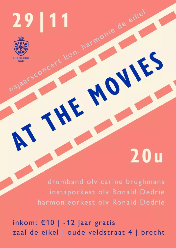 Op zaterdag 29 november geven onze drie orkesten weer het beste van zichzelf tijdens ons jaarconcert. Kom genieten van de optredens van onze drumband, instaporkest en harmonieorkest tijdens een avond 'At the movies'. We rollen onze rode loper voor jullie uit en zorgen voor popcorn om in de juiste sfeer te komen. Kom je in gala-outfit? Dan kan je een prijs winnen!