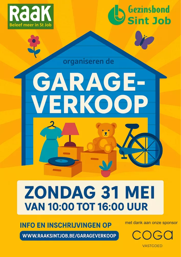 RAAK St Job in samenwerking met de Gezinsbond St Job organiseren de 16de garageverkoop van 10u00 tot 16u00, door gans onze gemeente! Dit is dé kans om unieke tweedehands spullen te vinden, van kleding en speelgoed tot meubels en decoratie. Kom gezellig snuffelen en scoor mooie koopjes! Of doe zelf mee en geef je spullen een tweede leven.