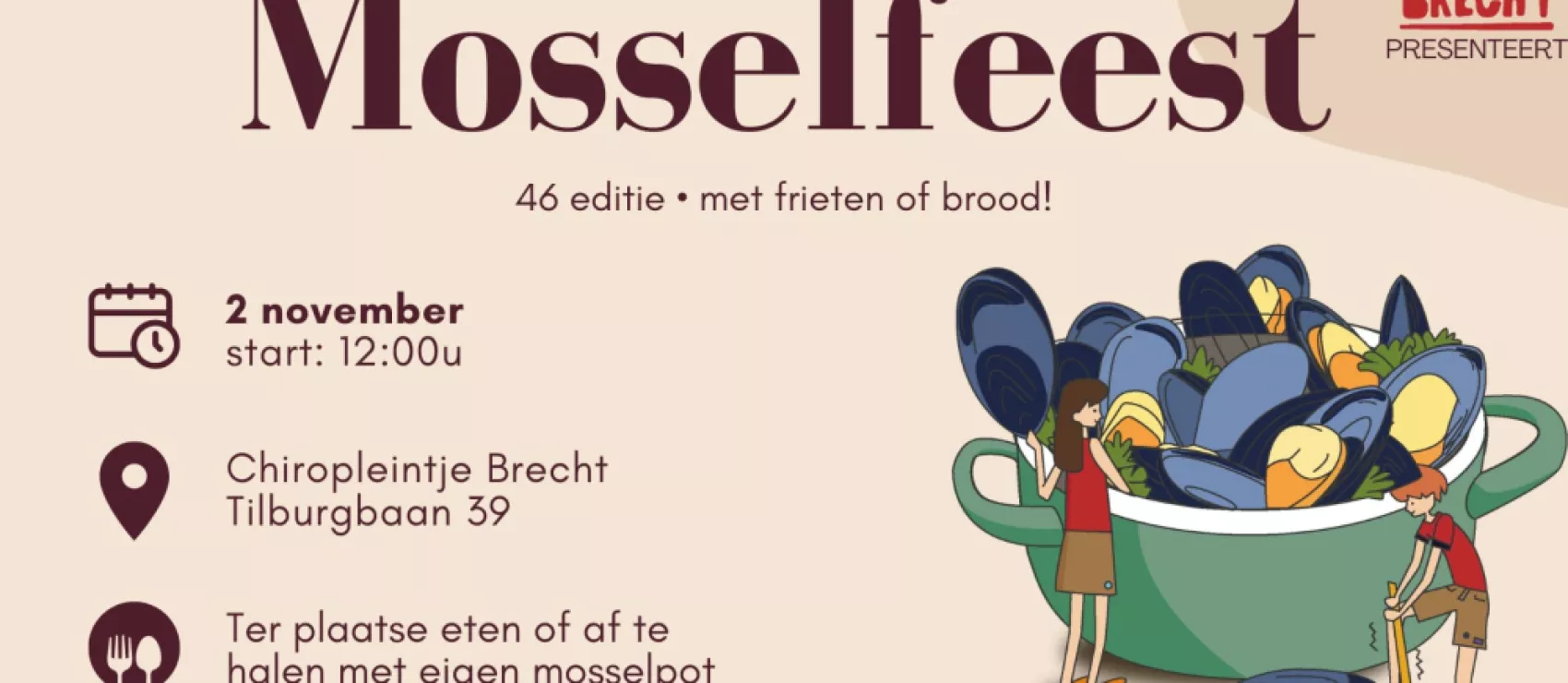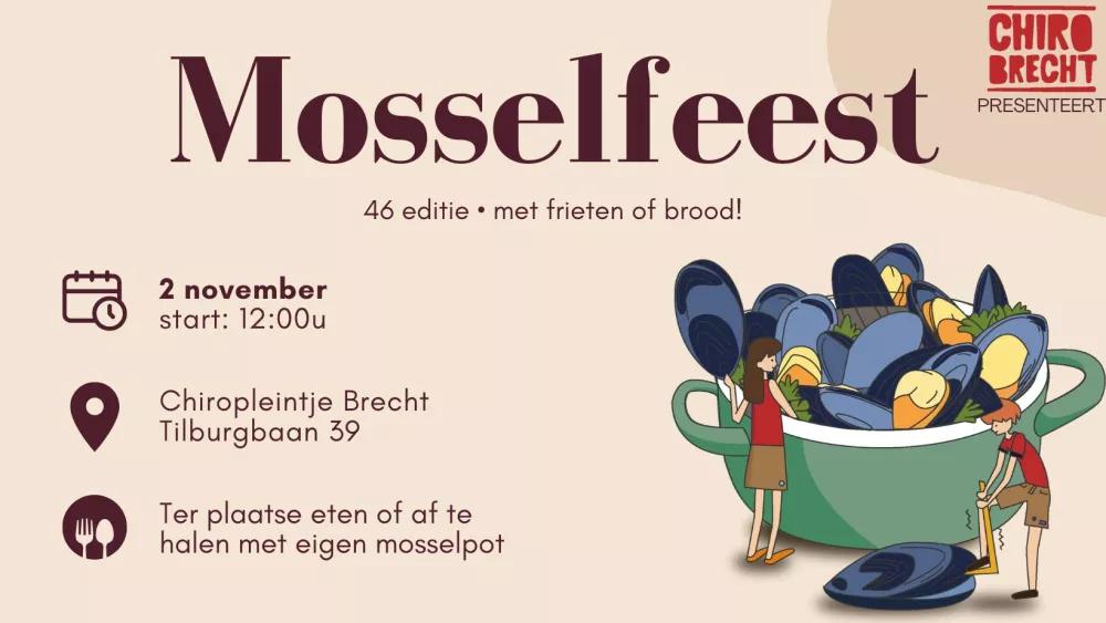 Op zondag 2 november nodigen we je van harte uit op ons gezellige Mosselfeest 2025 op het chiropleintje van Chiro Brecht! Vanaf 12 uur kun je genieten van heerlijke mosselen, geserveerd met brood of frietjes. Je hebt de keuze om ze lekker ter plaatse op te eten, of om ze af te halen – vergeet dan zeker niet je eigen mosselpot mee te brengen!🍴