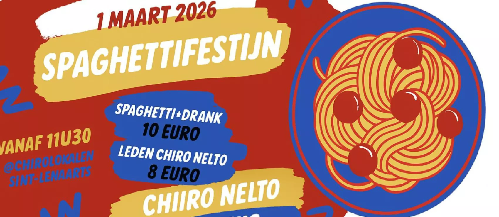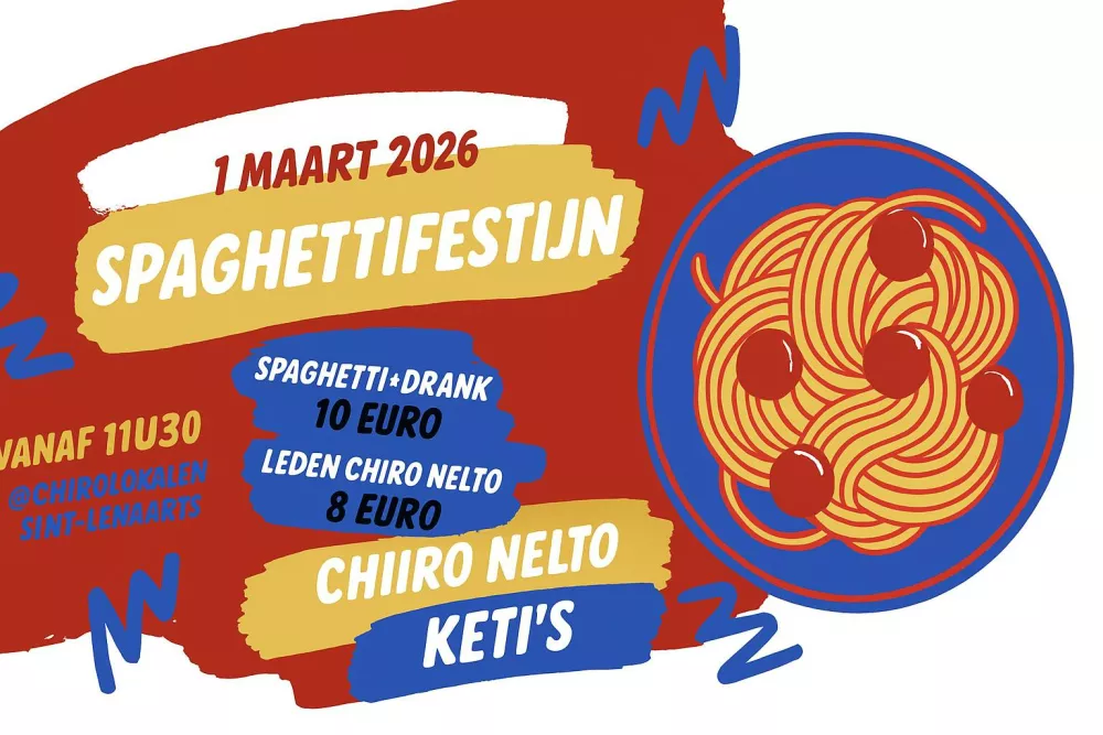 Op zondag 1 maart is het weer zover: het jaarlijkse Spaghettifestijn van de Keti's van Chiro Nelto! Kom samen met je familie en vrienden genieten van een heerlijke spaghetti, klaargemaakt door onze enthousiaste Keti's!